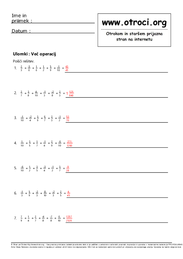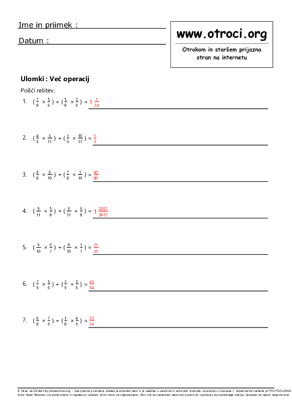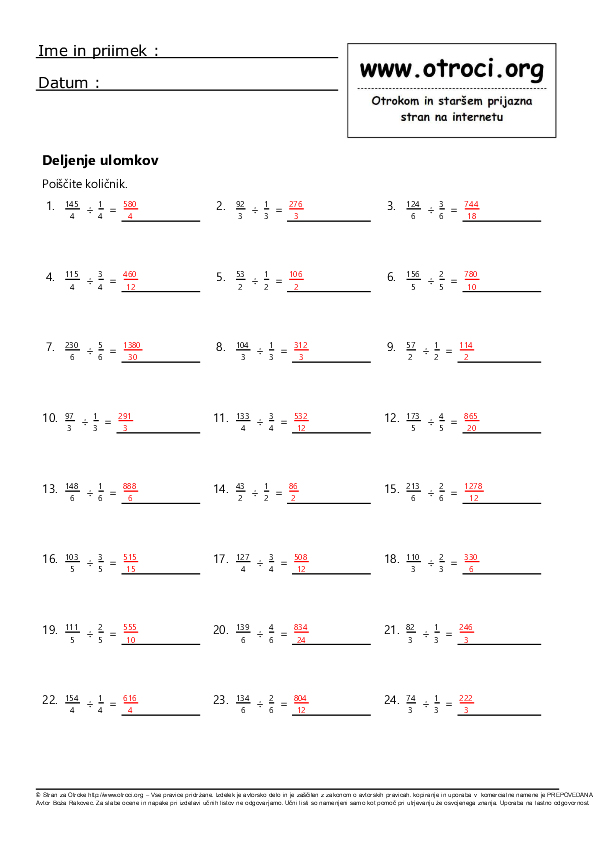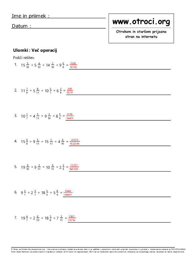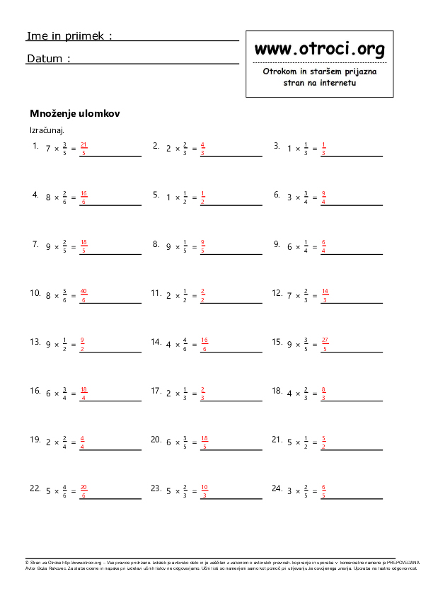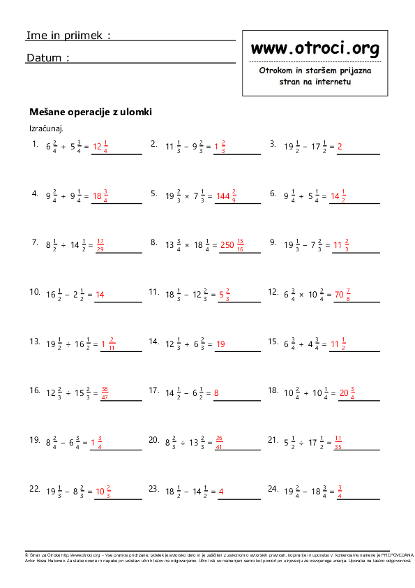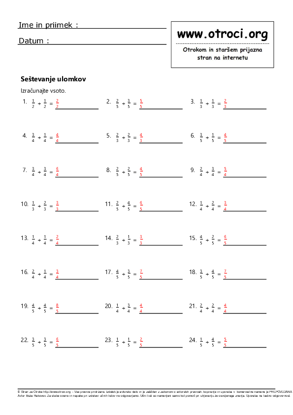 Skupaj 240 učnih listov z rešitvami ! Seštevanje ulomkov s skupnim imenovalcem horizontalno Seštevanje ulomkov s skupnim imenovalcem in s kardinalnimi številkami horizontalno Seštevanje ulomkov brez skupnega imenovalca horizontalno Seštevanje ulomkov brez skupnega imenovalca in s kardinalnimi številkami horizontalno Seštevanje ulomkov s skupnim imenovalcem vertikalno Seštevanje ulomkov brez skupnega imenovalca vertikalno ODŠTEVANJE ULOMKOV Skupaj 240 učnih listov z rešitvami ! Odštevanje ulomkov s skupnim imenovalcem horizontalno Odštevanje ulomkov s skupnim imenovalcem in s kardinalnimi številkami horizontalno Odštevanje ulomkov brez skupnega imenovalca horizontalno Odštevanje ulomkov brez skupnega imenovalca in s kardinalnimi številkami horizontalno Odštevanje ulomkov s skupnim imenovalcem vertikalno Odštevanje ulomkov brez skupnega imenovalca vertikalno MNOŽENJE ULOMKOV Skupaj 180 učnih listov z rešitvami ! Množenje ulomkov s skupnim imenovalcem Množenje ulomkov s skupnim imenovalcem in s kardinalnimi številkami Množenje ulomkov brez skupnega imenovalca Množenje ulomkov brez skupnega imenovalca in s kardinalnimi številkami DELJENJE ULOMKOV Skupaj 180 učnih listov z rešitvami ! Deljenje ulomkov s skupnim imenovalcem Deljenje ulomkov s skupnim imenovalcem in s kardinalnimi številkami Deljenje ulomkov brez skupnega imenovalca Deljenje ulomkov brez skupnega imenovalca in s kardinalnimi številkami MEŠANE OPERACIJE Z ULOMKI Skupaj 150 učnih listov z rešitvami ! Seštevanje ulomkov Odštevanje ulomkov Množenje ulomkov Deljenje ulomkov Ulomki mešano POENOSTAVITE ULOMKE Skupaj 90 učnih listov z rešitvami ! Pravilni ulomki Nepravilni ulomki Nepravilni ulomki brez ostanka MEŠANA ŠTEVILA IN NEPRAVILNI ULOMKI Skupaj 180 učnih listov z rešitvami ! Mešano v nepravilne : Imenovalec 2, imenovalec 3-4, imenovalec 5-6 Nepravilni v mešano : Imenovalec 2, imenovalec 3-4, imenovalec 5-6 PRIMERJAVA ULOMKOV Skupaj 240 učnih listov z rešitvami ! Pravilni ulomki s skupnim imenovalcem Pravilni ulomki brez skupnega imenovalca Nepravilni ulomki brez skupnega imenovalca Enakovredni ulomki s skupnim imenovalcem Enakovredni ulomki brez skupnega imenovalca Cela števila s skupnim imenovalcem Cela števila brez skupnega imenovalca ULOMKI IN DECIMALKE Skupaj 360 učnih listov z rešitvami ! Ulomki na 2 decimalki brez kardinalnih številk Ulomki na 2 decimalki s kardinalnimi številkami Ulomki na 3 decimalke brez kardinalnih številk Ulomki na 3 decimalke s kardinalnimi številkami Ulomki na 4 decimalke brez kardinalnih številk Ulomki na 4 decimalke s kardinalnimi številkami ULOMKI NA ŠTEVILSKI ČRTI Skupaj 30 učnih listov z rešitvami ! Ulomki na številski črti - lahke naloge Ulomki na številski črti - težje naloge Ulomki na številski črti - najtežje naloge SEŠTEVANJE ULOMKOV VEČ OPERACIJ Skupaj 360 učnih listov z rešitvami ! Seštevanje ulomkov brez kardinalnih številk in brez skupnega imenovalca s pozitivnim števcem in imenovalcem Seštevanje ulomkov brez kardinalnih številk in brez skupnega imenovalca z negativnim števcem in imenovalcem Seštevanje ulomkov brez kardinalnih številk in s skupnim imenovalcem s pozitivnim števcem in imenovalcem Seštevanje ulomkov brez kardinalnih številk in s skupnim imenovalcem z negativnim števcem in imenovalcem Seštevanje ulomkov s kardinalnimi številkami in brez skupnega imenovalca s pozitivnim števcem in imenovalcem Seštevanje ulomkov s kardinalnimi številkami in brez skupnega imenovalca z negativnim števcem in imenovalcem Seštevanje ulomkov s kardinalnimi številkami in s skupnim imenovalcem s pozitivnim števcem in imenovalcem Seštevanje ulomkov s kardinalnimi številkami in s skupnim imenovalcem z negativnim števcem in imenovalcem ODŠTEVANJE ULOMKOV VEČ OPERACIJ Skupaj 360 učnih listov z rešitvami ! Odštevanje ulomkov brez kardinalnih številk in brez skupnega imenovalca s pozitivnim števcem in imenovalcem Odštevanje ulomkov brez kardinalnih številk in brez skupnega imenovalca z negativnim števcem in imenovalcem Odštevanje ulomkov brez kardinalnih številk in s skupnim imenovalcem s pozitivnim števcem in imenovalcem Odštevanje ulomkov brez kardinalnih številk in s skupnim imenovalcem z negativnim števcem in imenovalcem Odštevanje ulomkov s kardinalnimi številkami in brez skupnega imenovalca s pozitivnim števcem in imenovalcem Odštevanje ulomkov s kardinalnimi številkami in brez skupnega imenovalca z negativnim števcem in imenovalcem Odštevanje ulomkov s kardinalnimi številkami in s skupnim imenovalcem s pozitivnim števcem in imenovalcem Odštevanje ulomkov s kardinalnimi številkami in s skupnim imenovalcem z negativnim števcem in imenovalcem MNOŽENJE ULOMKOV VEČ OPERACIJ Skupaj 360 učnih listov z rešitvami ! Množenje ulomkov brez kardinalnih številk in brez skupnega imenovalca s pozitivnim števcem in imenovalcem Množenje ulomkov brez kardinalnih številk in brez skupnega imenovalca z negativnim števcem in imenovalcem Množenje ulomkov brez kardinalnih številk in s skupnim imenovalcem s pozitivnim števcem in imenovalcem Množenje ulomkov brez kardinalnih številk in s skupnim imenovalcem z negativnim števcem in imenovalcem Množenje ulomkov s kardinalnimi številkami in brez skupnega imenovalca s pozitivnim števcem in imenovalcem Množenje ulomkov s kardinalnimi številkami in brez skupnega imenovalca z negativnim števcem in imenovalcem Množenje ulomkov s kardinalnimi številkami in s skupnim imenovalcem s pozitivnim števcem in imenovalcem Množenje ulomkov s kardinalnimi številkami in s skupnim imenovalcem z negativnim števcem in imenovalcem DELJENJE ULOMKOV VEČ OPERACIJ Skupaj 360 učnih listov z rešitvami ! Deljenje ulomkov brez kardinalnih številk in brez skupnega imenovalca s pozitivnim števcem in imenovalcem Deljenje ulomkov brez kardinalnih številk in brez skupnega imenovalca z negativnim števcem in imenovalcem Deljenje ulomkov brez kardinalni