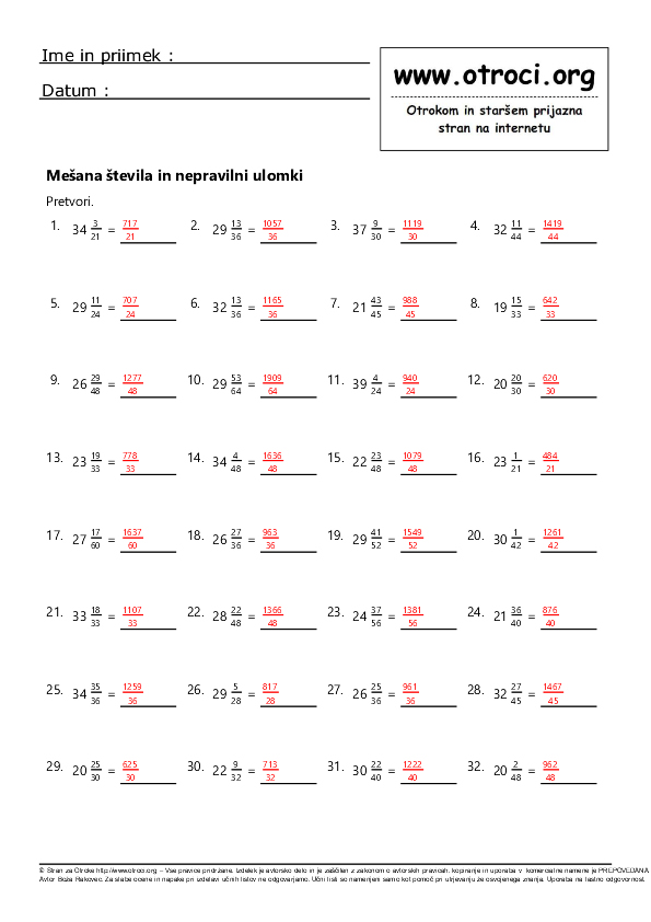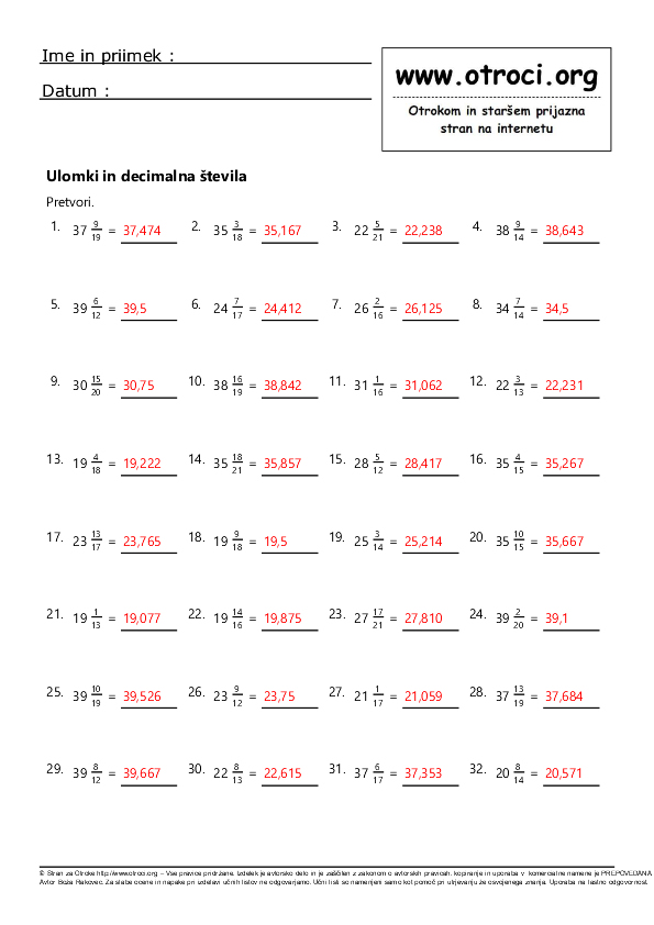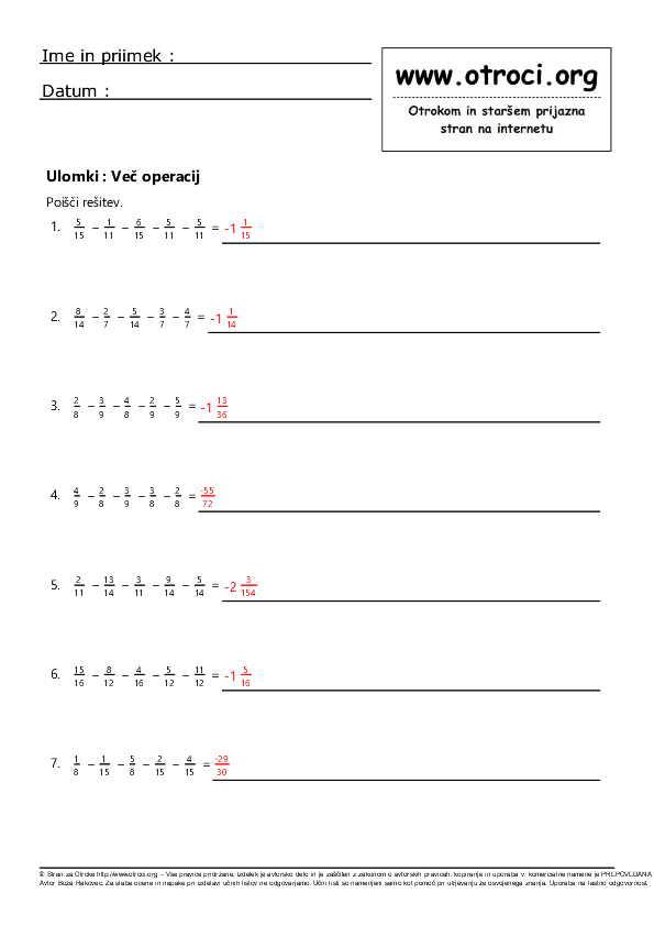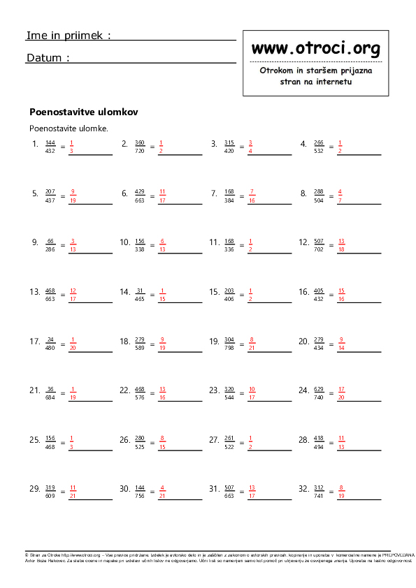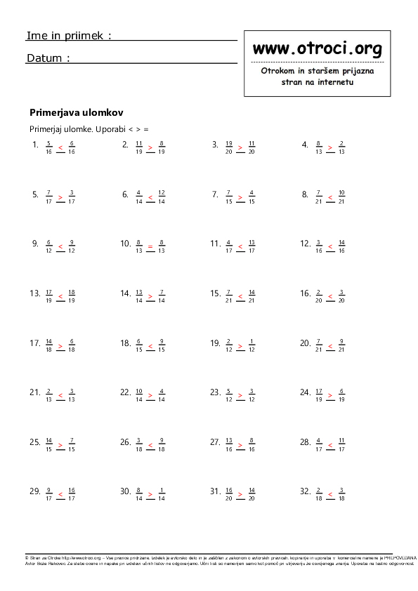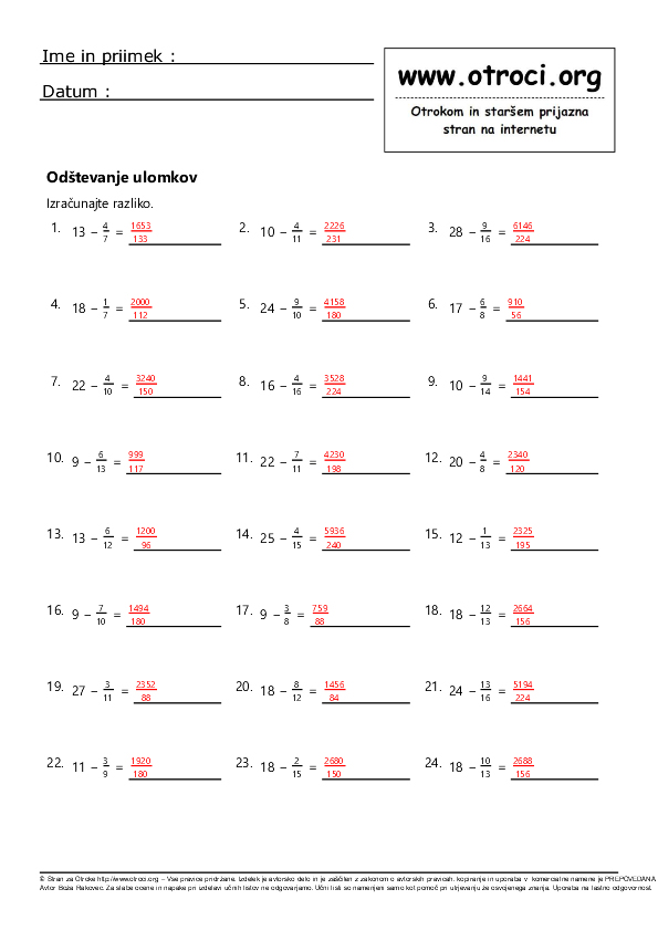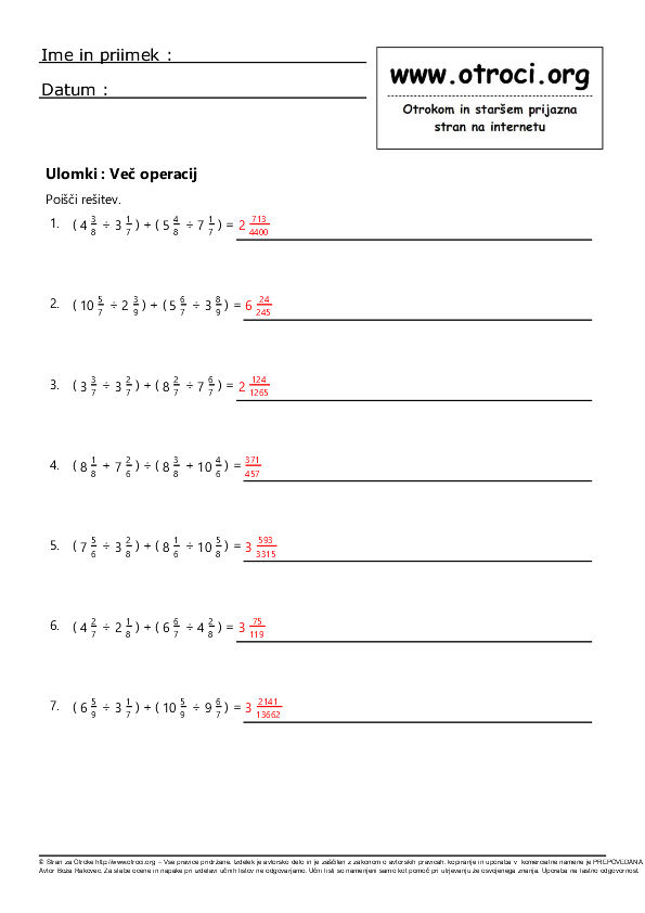 Skupaj 240 učnih listov z rešitvami ! Seštevanje ulomkov s skupnim imenovalcem horizontalno Seštevanje ulomkov s skupnim imenovalcem in s kardinalnimi številkami horizontalno Seštevanje ulomkov brez skupnega imenovalca horizontalno Seštevanje ulomkov brez skupnega imenovalca in s kardinalnimi številkami horizontalno Seštevanje ulomkov s skupnim imenovalcem vertikalno Seštevanje ulomkov brez skupnega imenovalca vertikalno ODŠTEVANJE ULOMKOV Skupaj 240 učnih listov z rešitvami ! Odštevanje ulomkov s skupnim imenovalcem horizontalno Odštevanje ulomkov s skupnim imenovalcem in s kardinalnimi številkami horizontalno Odštevanje ulomkov brez skupnega imenovalca horizontalno Odštevanje ulomkov brez skupnega imenovalca in s kardinalnimi številkami horizontalno Odštevanje ulomkov s skupnim imenovalcem vertikalno Odštevanje ulomkov brez skupnega imenovalca vertikalno MNOŽENJE ULOMKOV Skupaj 180 učnih listov z rešitvami ! Množenje ulomkov s skupnim imenovalcem Množenje ulomkov s skupnim imenovalcem in s kardinalnimi številkami Množenje ulomkov brez skupnega imenovalca Množenje ulomkov brez skupnega imenovalca in s kardinalnimi številkami DELJENJE ULOMKOV Skupaj 180 učnih listov z rešitvami ! Deljenje ulomkov s skupnim imenovalcem Deljenje ulomkov s skupnim imenovalcem in s kardinalnimi številkami Deljenje ulomkov brez skupnega imenovalca Deljenje ulomkov brez skupnega imenovalca in s kardinalnimi številkami MEŠANE OPERACIJE Z ULOMKI Skupaj 150 učnih listov z rešitvami ! Seštevanje ulomkov Odštevanje ulomkov Množenje ulomkov Deljenje ulomkov Ulomki mešano POENOSTAVITE ULOMKE Skupaj 90 učnih listov z rešitvami ! Pravilni ulomki Nepravilni ulomki Nepravilni ulomki brez ostanka MEŠANA ŠTEVILA IN NEPRAVILNI ULOMKI Skupaj 180 učnih listov z rešitvami ! Mešano v nepravilne : Imenovalec 2, imenovalec 3-4, imenovalec 5-6 Nepravilni v mešano : Imenovalec 2, imenovalec 3-4, imenovalec 5-6 PRIMERJAVA ULOMKOV Skupaj 240 učnih listov z rešitvami ! Pravilni ulomki s skupnim imenovalcem Pravilni ulomki brez skupnega imenovalca Nepravilni ulomki brez skupnega imenovalca Enakovredni ulomki s skupnim imenovalcem Enakovredni ulomki brez skupnega imenovalca Cela števila s skupnim imenovalcem Cela števila brez skupnega imenovalca ULOMKI IN DECIMALKE Skupaj 360 učnih listov z rešitvami ! Ulomki na 2 decimalki brez kardinalnih številk Ulomki na 2 decimalki s kardinalnimi številkami Ulomki na 3 decimalke brez kardinalnih številk Ulomki na 3 decimalke s kardinalnimi številkami Ulomki na 4 decimalke brez kardinalnih številk Ulomki na 4 decimalke s kardinalnimi številkami ULOMKI NA ŠTEVILSKI ČRTI Skupaj 30 učnih listov z rešitvami ! Ulomki na številski črti - lahke naloge Ulomki na številski črti - težje naloge Ulomki na številski črti - najtežje naloge SEŠTEVANJE ULOMKOV VEČ OPERACIJ Skupaj 360 učnih listov z rešitvami ! Seštevanje ulomkov brez kardinalnih številk in brez skupnega imenovalca s pozitivnim števcem in imenovalcem Seštevanje ulomkov brez kardinalnih številk in brez skupnega imenovalca z negativnim števcem in imenovalcem Seštevanje ulomkov brez kardinalnih številk in s skupnim imenovalcem s pozitivnim števcem in imenovalcem Seštevanje ulomkov brez kardinalnih številk in s skupnim imenovalcem z negativnim števcem in imenovalcem Seštevanje ulomkov s kardinalnimi številkami in brez skupnega imenovalca s pozitivnim števcem in imenovalcem Seštevanje ulomkov s kardinalnimi številkami in brez skupnega imenovalca z negativnim števcem in imenovalcem Seštevanje ulomkov s kardinalnimi številkami in s skupnim imenovalcem s pozitivnim števcem in imenovalcem Seštevanje ulomkov s kardinalnimi številkami in s skupnim imenovalcem z negativnim števcem in imenovalcem ODŠTEVANJE ULOMKOV VEČ OPERACIJ Skupaj 360 učnih listov z rešitvami ! Odštevanje ulomkov brez kardinalnih številk in brez skupnega imenovalca s pozitivnim števcem in imenovalcem Odštevanje ulomkov brez kardinalnih številk in brez skupnega imenovalca z negativnim števcem in imenovalcem Odštevanje ulomkov brez kardinalnih številk in s skupnim imenovalcem s pozitivnim števcem in imenovalcem Odštevanje ulomkov brez kardinalnih številk in s skupnim imenovalcem z negativnim števcem in imenovalcem Odštevanje ulomkov s kardinalnimi številkami in brez skupnega imenovalca s pozitivnim števcem in imenovalcem Odštevanje ulomkov s kardinalnimi številkami in brez skupnega imenovalca z negativnim števcem in imenovalcem Odštevanje ulomkov s kardinalnimi številkami in s skupnim imenovalcem s pozitivnim števcem in imenovalcem Odštevanje ulomkov s kardinalnimi številkami in s skupnim imenovalcem z negativnim števcem in imenovalcem MNOŽENJE ULOMKOV VEČ OPERACIJ Skupaj 360 učnih listov z rešitvami ! Množenje ulomkov brez kardinalnih številk in brez skupnega imenovalca s pozitivnim števcem in imenovalcem Množenje ulomkov brez kardinalnih številk in brez skupnega imenovalca z negativnim števcem in imenovalcem Množenje ulomkov brez kardinalnih številk in s skupnim imenovalcem s pozitivnim števcem in imenovalcem Množenje ulomkov brez kardinalnih številk in s skupnim imenovalcem z negativnim števcem in imenovalcem Množenje ulomkov s kardinalnimi številkami in brez skupnega imenovalca s pozitivnim števcem in imenovalcem Množenje ulomkov s kardinalnimi številkami in brez skupnega imenovalca z negativnim števcem in imenovalcem Množenje ulomkov s kardinalnimi številkami in s skupnim imenovalcem s pozitivnim števcem in imenovalcem Množenje ulomkov s kardinalnimi številkami in s skupnim imenovalcem z negativnim števcem in imenovalcem DELJENJE ULOMKOV VEČ OPERACIJ Skupaj 360 učnih listov z rešitvami ! Deljenje ulomkov brez kardinalnih številk in brez skupnega imenovalca s pozitivnim števcem in imenovalcem Deljenje ulomkov brez kardinalnih številk in brez skupnega imenovalca z negativnim števcem in imenovalcem Deljenje ulomkov brez kardinalni