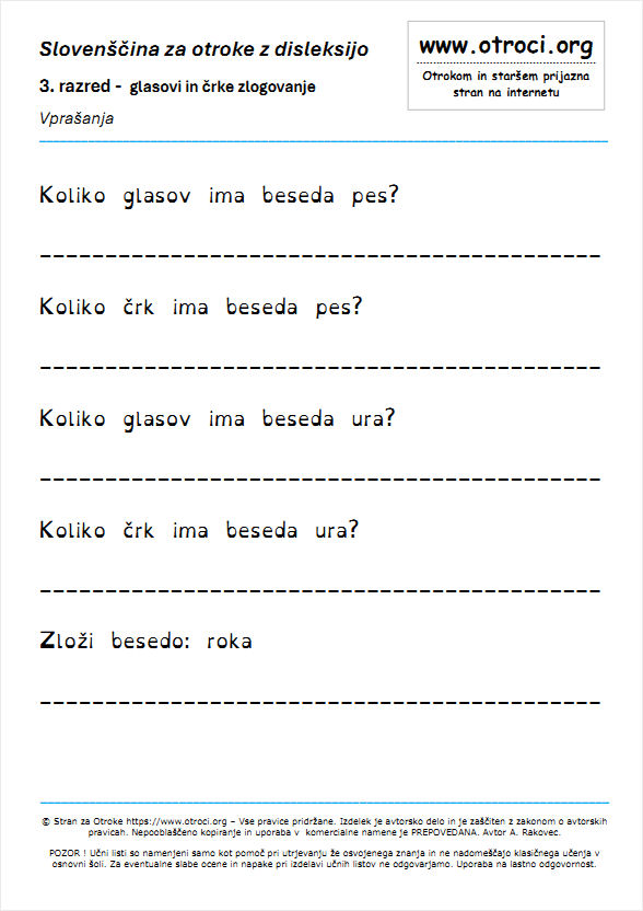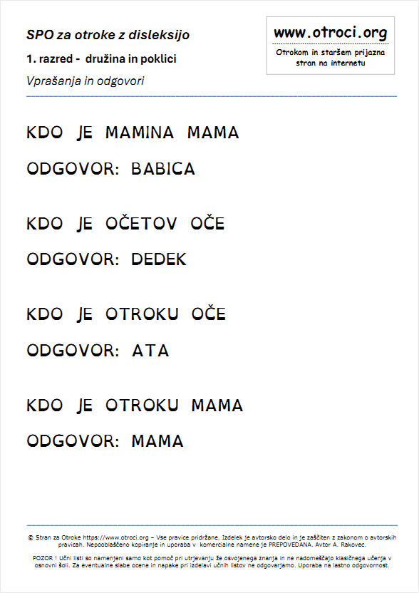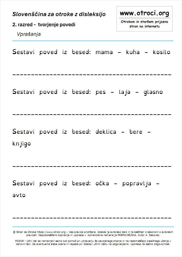 POZOR ! Učne liste so izdelali sodelavci strani za otroke. Namenjeni so samo kot pomoč pri utrjevanju že osvojenega znanja in ne nadomeščajo klasičnega učenja v osnovni šoli. Za eventuelne slabe ocene in eventuelne napake pri izdelavi učnih listov ne odgovarjamo. Uporaba učnih listov je na lastno odgovornost. Ves ta material, je v lasti strani za otroke www.otroci.org. Avtorstvo tega materiala je zašciteno z zakonom o avtorskih pravicah. Uporaba ucnih listov je dovoljena samo za osebno rabo. Vsako kopiranje in uporaba v komercijalne namene brez predhodnega dogovora je prepovedana. P O M E M B N O ! Copyright © ARcom,Alojz Rakovec s.p. Vse pravice so pridržane. Za dodatne informacije smo vam na voljo na : |