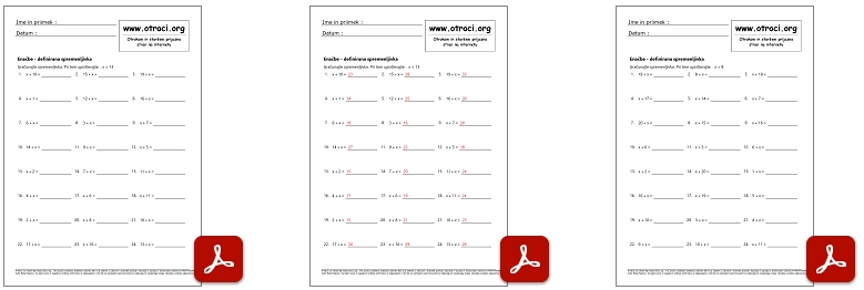 Skupaj 240 učnih listov z rešitvami ! Enačbe defenirana spremenljivka - seštevanje