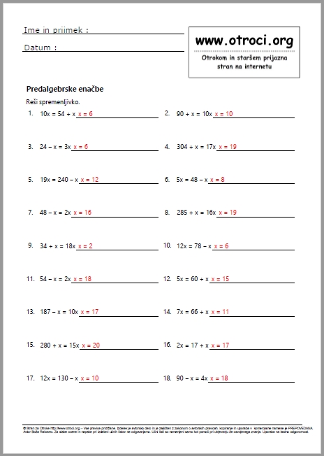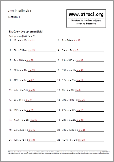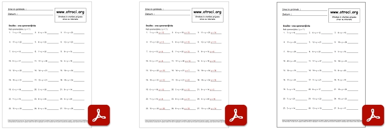 Skupaj 90 učnih listov z rešitvami ! Enačbe dve spremenljivki - spremenljivka do 20