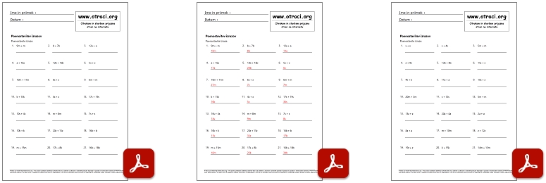 Skupaj 60 učnih listov z rešitvami ! Poenostavitev izrazov - seštevanje