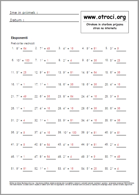 Skupaj 40 učnih listov z rešitvami ! Eksponenti na 2