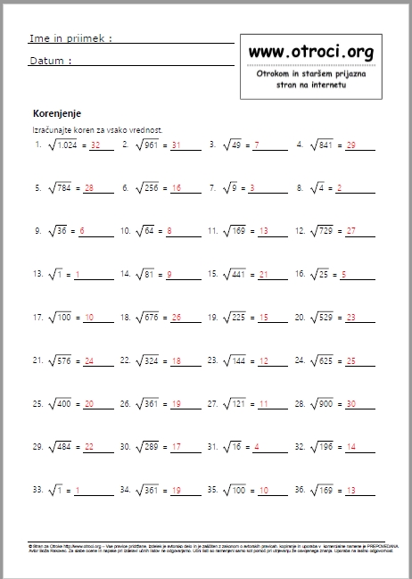 Skupaj 50 učnih listov z rešitvami ! Korenjenje na 2
