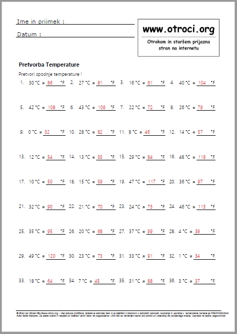 Skupaj 60 učnih listov z rešitvami ! Stopinje celzija v stopinje fahrenheit