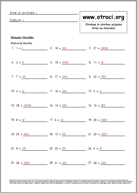 Skupaj 180 učnih listov z rešitvami ! Rimske številke - arabske številke v rimske številke
